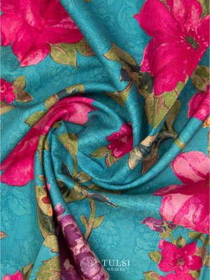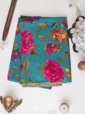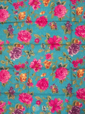 This printed silk blouse is adorned with vibrant Teal Blue colour with flowers and leaves patterns all over.