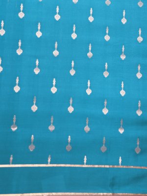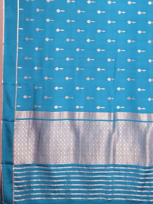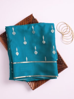 A teal-blue Mysore silk saree adorned with graceful floral buttas, radiating sophisticated charm. Soft and lightweight fabric ensures effortless draping and all-day ease. A lustrous finish and intricate motifs make it an ideal choice for every celebration. A versatile design blending traditional elegance with contemporary style.