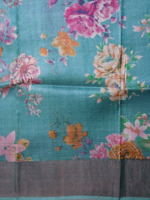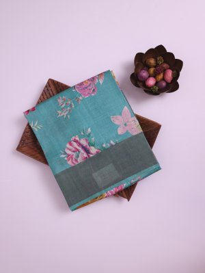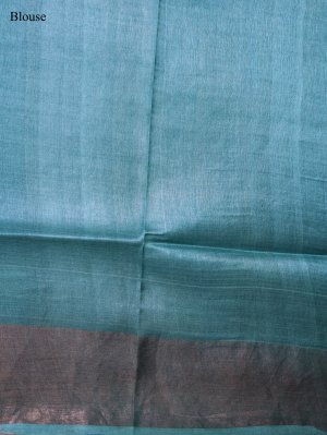 This Teal Blue Tussar Silk saree reveals a grainy, lustrous texture that drapes with elegant structure and airy comfort. The wide orangish-brown border provides a heavy metallic contrast against the delicate pastel floral motifs scattered across the body. Ornate zari stripes finish the pallu with a rich shimmer, ensuring a striking silhouette for grand celebrations and formal gatherings.