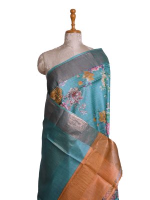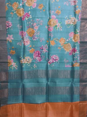 Blue Printed Tussar Silk Saree