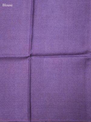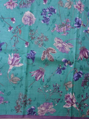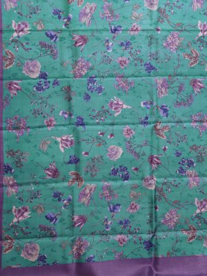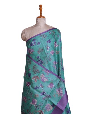 This Teal Blue Printed Tussar Silk Saree features a lightweight, grainy texture across the body adorned with intricate all-over floral motifs. The piece is framed by a solid purple-toned border with a smooth, matte structural finish that provides a clean contrast to the textured fabric. The pallu is finished with a simple tonal drape, highlighting the fluid fall and natural sheen of the wild silk material for a refined aesthetic.