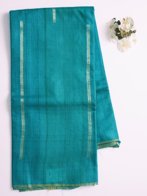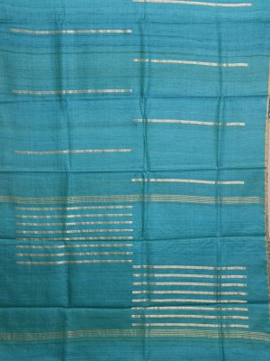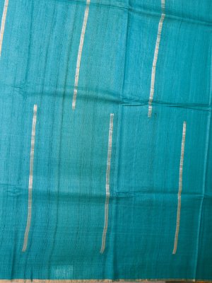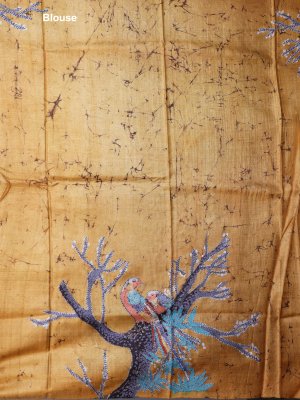This elegant Tussar Silk Saree in teal green features intricate zari work along the lower border, adding a subtle shimmer. The contrasting honey mustard blouse is embellished with a delicate batik print and vibrant floral kantha embroidery. Hints of blue, orange, grey, off-white, red, light blue, and yellow create a lively and artistic pattern. Perfect for festive occasions or celebrations, this saree effortlessly blends traditional charm with contemporary flair.