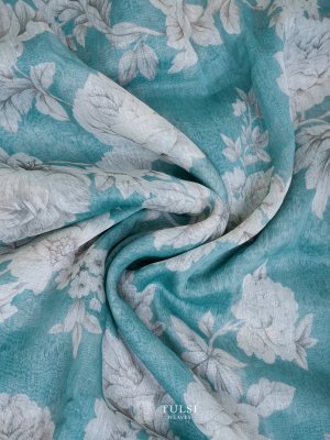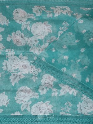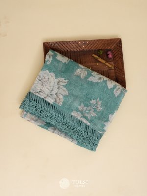This Teal linen silk saree is adorned with a graceful floral print on the body and an elegant lace border. Its lightweight and airy fabric make it a perfect choice for any refined occasion.