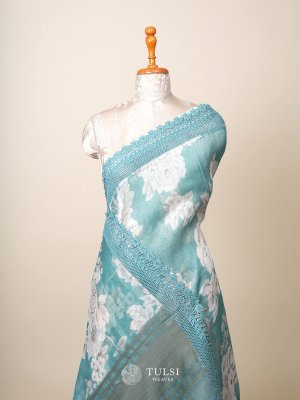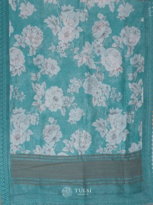 Teal Printed Linen Silk Saree with Lace Border