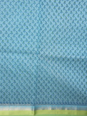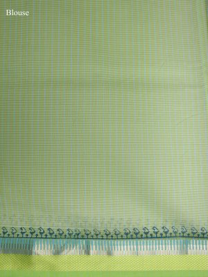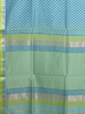 This Turquoise Blue Maheshwari Cotton saree features a lightweight body adorned with small repeated floral motifs and a delicate textured weave throughout the fabric. The piece is defined by a structured light green border incorporating metallic thread and geometric stripes for a crisp, linear contrast. The finishing of the pallu extends this striped theme with alternating blocks of color and fine metallic accents that create a clean, contemporary drape.