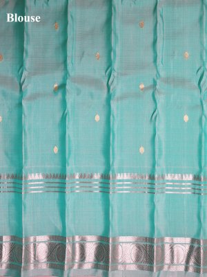 This Gadwal silk saree in a stunning turquoise green features a body adorned with intricate silver zari checks, complemented by exquisite peacock and kamalam buttas in gold and silver zari. The border and pallu showcase elaborate, unique silver zari patterns, adding a regal and elegant touch. Perfect for festive occasions or weddings, this saree blends traditional craftsmanship with timeless sophistication.