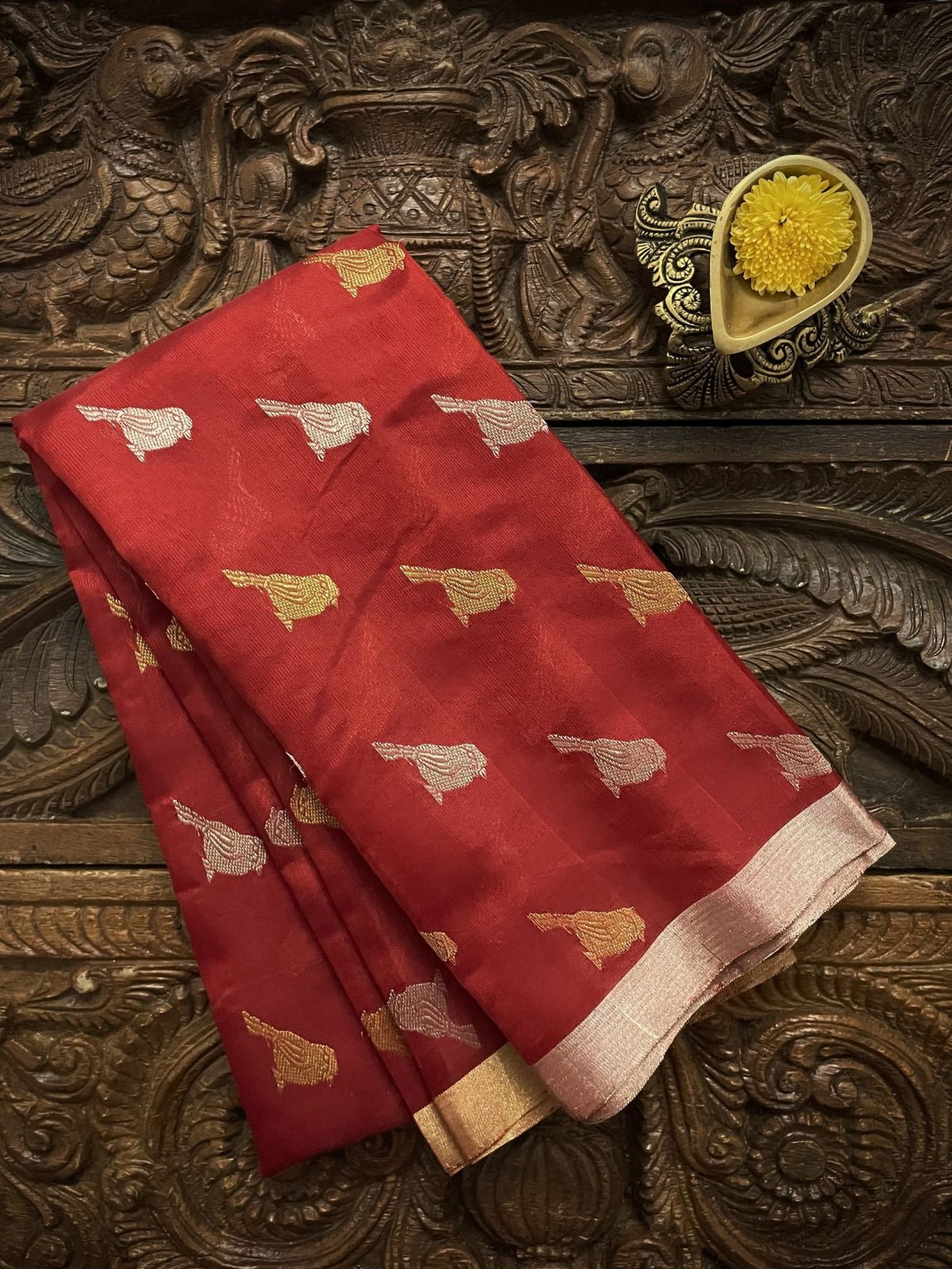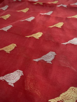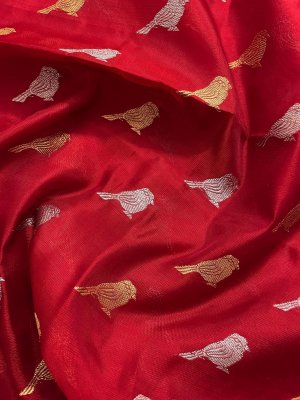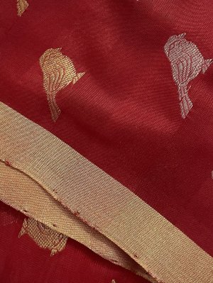 This Handwoven Vermillion Red Chanderi Silk Blouse is embellished with gold and silver zari bird motifs accompanied by gold and silver borders.
