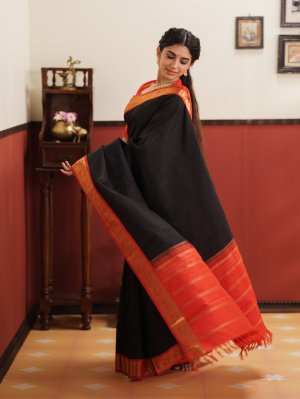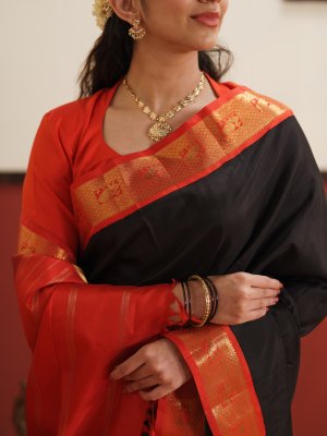This Black Kanjeevaram Silk Saree embodies timeless South Indian grace with its deep, inky body adorned with subtle woven buttas that add a quiet, traditional charm. The rich dark-orange border, highlighted with intricate zari motifs, brings a striking contrast reminiscent of classic vintage Kanjeevarams. Its pallu continues the same heritage-inspired detailing, lending the saree a nostalgic old-world aura. Elegant, bold, and rooted in tradition.