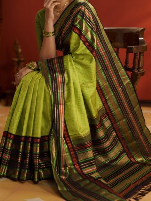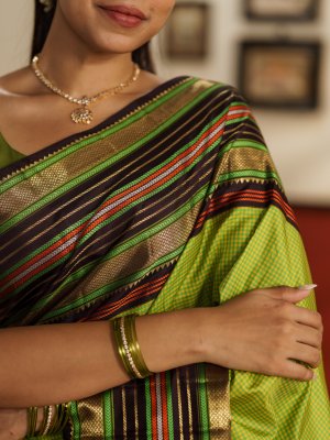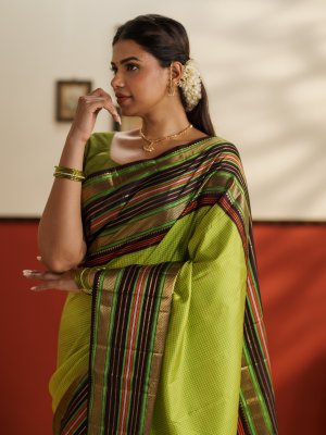 This Yellow and Light Green Checked Kanjeevaram Silk Saree brings a warm nostalgic charm with its softly glowing body and classic checkered weave. The rich dark brownish blue border adds a timeless touch, highlighted with traditional zari that enhances its heritage feel. The saree carries that old-vibe elegance—simple, graceful, and reminiscent of vintage Kanjeevarams treasured in family trunks. Perfect for anyone who loves a saree that blends cultural purity with understated sophistication.
