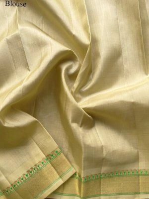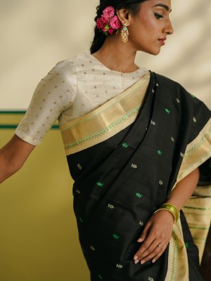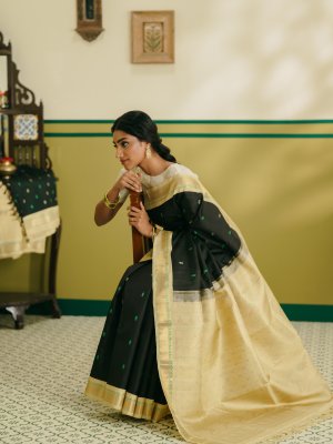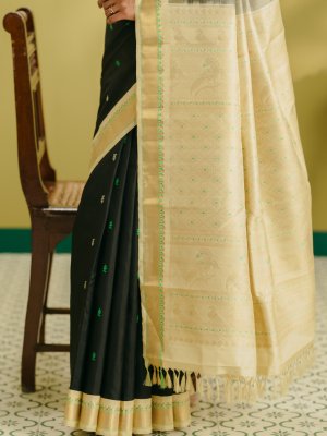 This Black Kanjeevaram silk saree features a graceful cream border. The body is adorned with two-tone floral buttas in green and cream, offering a rich yet balanced contrast. The beautifully crafted pallu showcases parrot, kamalam, and diamond motifs with exquisite green meena work, adding traditional charm to this timeless drape.