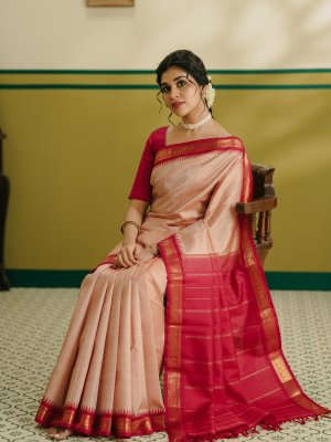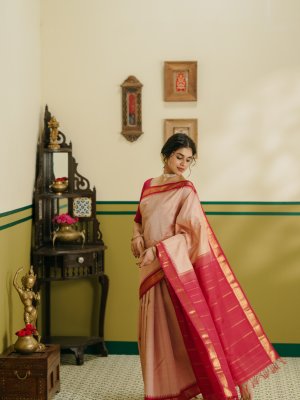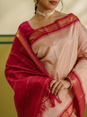 This light dusty pink Kanjeevaram silk saree features subtle pinkish-red stripes, complemented by a pinkish-red border wovenwith Pillaiyar temple design, along with traditional mango and kamalam motifs. Finished with a simple Muthu Seer pallu, this saree reflects timeless South Indian heritage and understated elegance—perfect for weddings and festive occasions.