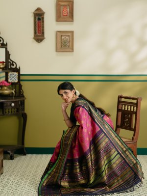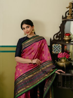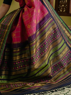 This Rani pink kanjeevaram silk saree comes with a dark navy blue border. The body features three-color silk checks in yellow, navy blue and white, adorned with elegant gold zari kamalam butta. The border is highlighted with parrot green, rani pink, and yellow pattupettu with classic gold zari detailing, and finished with a rich pallu. Perfect for weddings and festive occasions.