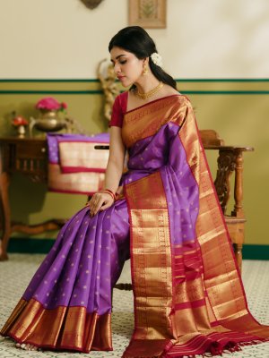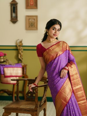 This graceful lavender Kanjeevaram silk saree is adorned with delicate kamalam buttis woven across the body, lending a soft floral charm and subtle sophistication. The rich maroon border is intricately detailed with a traditional blend of peacock and paisley motifs, beautifully complemented by vanki and neli designs that reflect classic south Indian artistry. The pallu is exquisitely crafted with three patts and finished with a refined muthu seer, completing the saree with timeless grandeur, regal elegance, and heirloom-worthy appeal.