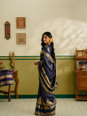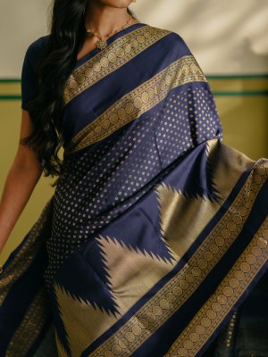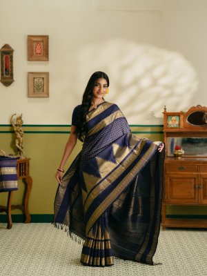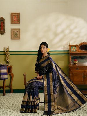 This Navy blue thazhampoo Kanjeevaram silk saree reflects timeless tradition and elegance, with the body adorned in delicate diamond-shaped gold zari dots that add subtle richness. It features a classic double border woven in the traditional Kamalam design, enhancing its regal appeal. The saree is complemented by a richly detailed pallu that showcases traditional craftsmanship, while elegant seepu rekku detailing completes the look with authentic Kanjeevaram artistry.