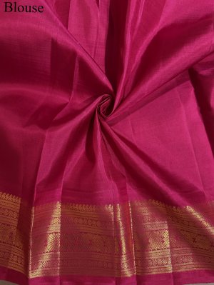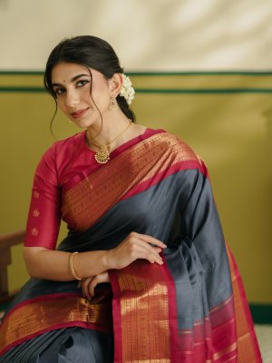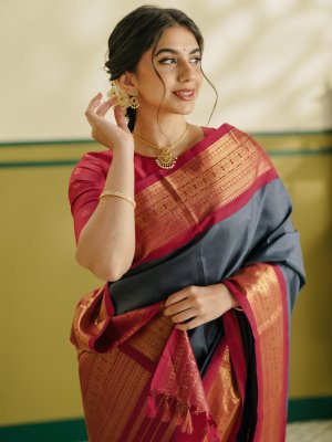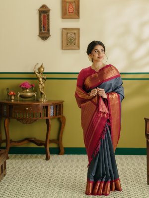 This elegant Kanjeevaram silk saree features a rich dark grey body with a deep maroon zari border. The border highlights a bold Kodi Kamalam design, complemented by Rudraksh, Vanki, and Banaras motifs. The richly woven 2-patta pallu adds depth and grandeur, showcasing traditional craftsmanship in every detail. Crafted in pure silk, it offers a smooth, lustrous drape, perfect for weddings and festive occasions when paired with a matching maroon blouse.