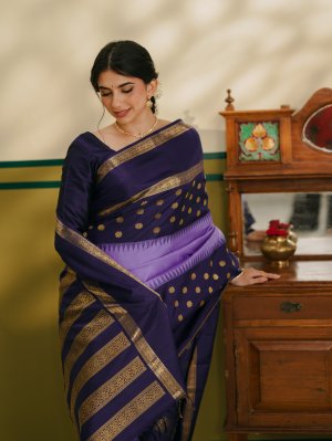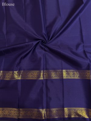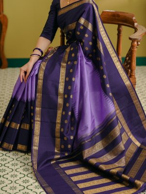 A graceful lavender Kanjeevaram silk saree highlighted by a rich dark purplish blue border that adds striking contrast. The border features a classic double pettu weave, beautifully adorned with kamalam buttis and the timeless pillaiyar temple motif, symbolising tradition and auspiciousness. The saree is completed with a grand 6-patta pallu, richly woven to enhance its regal appeal. An exquisite choice for weddings, festive occasions, and heritage celebrations.