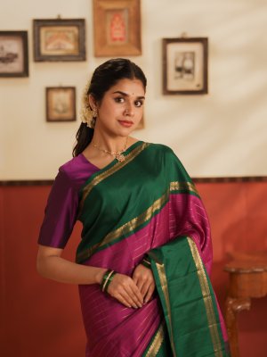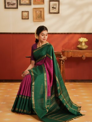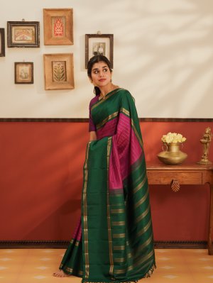This magenta pink Veldhari Kanjeevaram silk saree is elegantly paired with a rich emerald green double border, creating a striking traditional contrast. The body is adorned with finely woven zari veldhari that adds depth and texture to the silk. Gold zari manga and classic Banaras designs enhance the borders with timeless grandeur. Completing the look is a rich pattu pallu highlighted with six beautifully woven pattas, reflecting true Kanjeevaram craftsmanship.