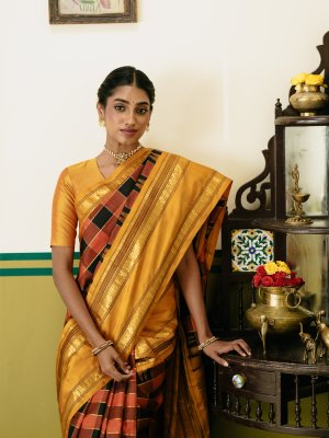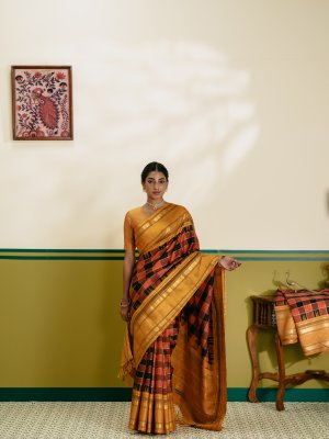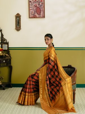 Description This rust and black checked Kanjeevaram silk saree features classic silk checks highlighted with elegant muthu checks woven in shimmering zari. A rich double border in gold zari lends a regal finish, while the mustard border is accentuated with bold black seer detailing. The grand pallu is adorned with four striking pattas, enhancing the traditional richness of the weave. A timeless choice for weddings and festive occasions.