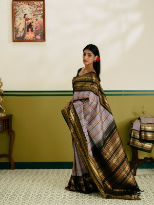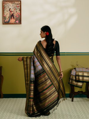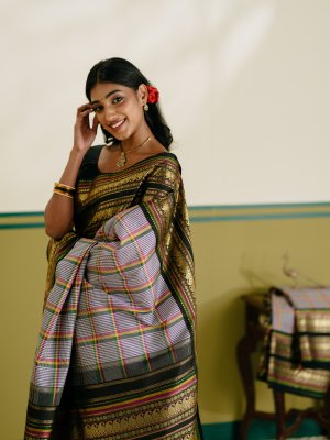 This elegant Multi color checked Kanjeevaram silk saree features a classic off-white base accentuated with black, violet, rani pink, yellow, and green checks, creating a vibrant yet balanced look. The saree is framed with a striking black retta pettu border, intricately woven with paisley, rudraksh, and Banaras-inspired motifs in rich zari. Completing the weave is a stunning 4-patta rich pallu, adding grandeur and traditional charm to this timeless Kanjeevaram.