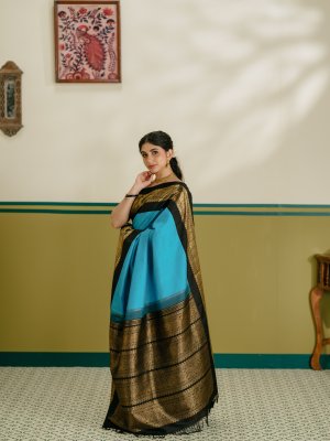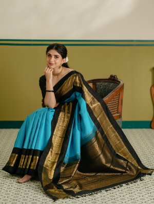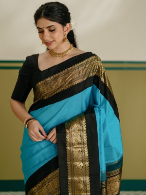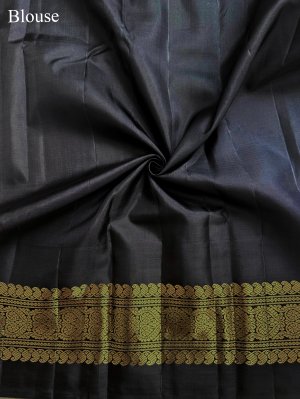 This elegant Kanjeevaram silk saree features a soothing light blue body highlighted with fine stripes in two harmonious shades of blue. The contrasting black border is beautifully woven with traditional motifs in rich gold zari, adding a classic and regal touch. The saree is finished with a luxurious 4 patta self–designed pallu, showcasing intricate craftsmanship and timeless appeal. Ideal for weddings, festive occasions, and special celebrations, this saree embodies refined South Indian heritage with modern grace.