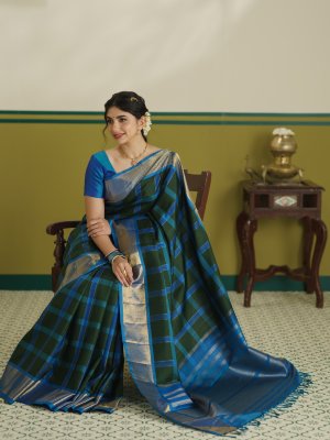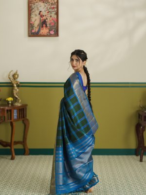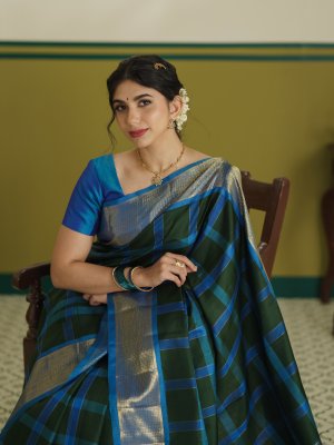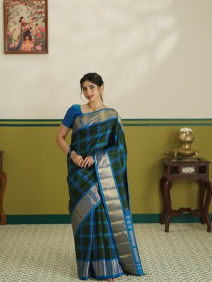 This classic dark green checked Kanjeevaram silk saree is beautifully contrasted with a rich Ananda blue border, creating a timeless and sophisticated appeal. The body features dark green and Ananda blue silk checks, gracefully overlaid with fine zari checks that add subtle shimmer. The border is adorned with neat small box-shaped zari designs, lending a structured traditional charm. Finished with a rich zari pallu, this saree is perfect for weddings, festive occasions, and traditional celebrations.