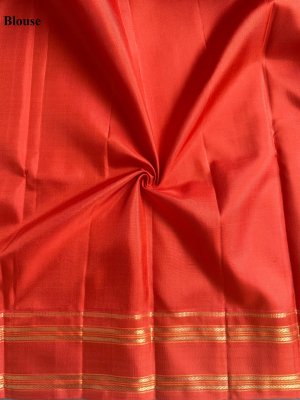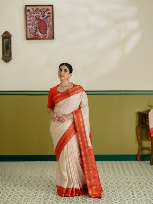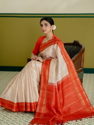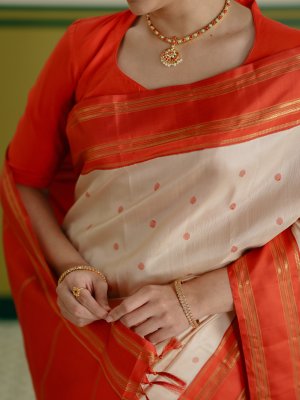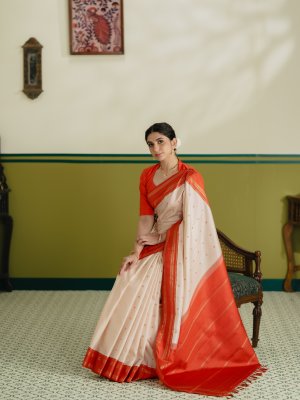 This graceful Cream Kanjeevaram silk saree is highlighted with a vibrant orange border that adds a striking contrast. The body features delicate paisa butties woven in orange silk thread, lending a subtle yet charming texture. The border is adorned with simple vanki and muthu motifs crafted in rich gold zari, enhancing its traditional appeal. Finished with a minimal muthu seer pallu, this saree beautifully balances simplicity and classic elegance, making it perfect for festive and traditional occasions.