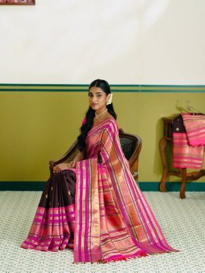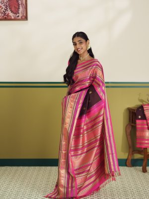 This dark brown Kanjeevaram silk saree is elegantly highlighted with a vibrant rani pink border. The body features classic kamalam butties in gold zari, while the broad border is richly woven with peacock, kuyil kan, and Banaras motifs in gold zari, accented with rudraksh and green silk thread designs. Finished with a rich pallu, this saree reflects timeless South Indian grandeur. Paired with a luxurious, richly woven pallu, this saree is a perfect blend of tradition, artistry, and opulence—ideal for weddings and grand festive occasions.