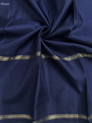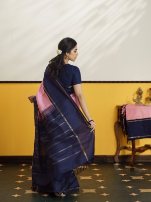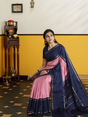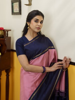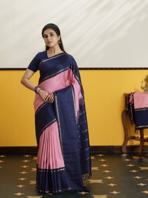 This graceful Pink and Off-White pin-checked Kanjeevaram silk saree is a beautiful blend of subtle charm and classic tradition. The soft pin checks across the body create a delicate texture, perfectly balanced by a navy blue border featuring a simple yet timeless retta pettu design woven in rich gold zari. Adding to its understated elegance, the saree is paired with a minimal muthu seer pallu, lending a serene and sophisticated finish. An ideal choice for those who love quiet luxury and heritage weaves with a contemporary touch.