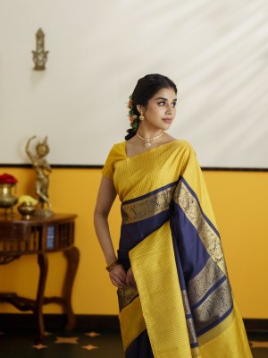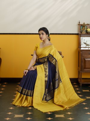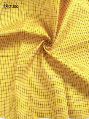 A timeless dark navy blue Kanjeevaram silk saree, beautifully contrasted with a sunny yellow checked border that adds a refined traditional charm. Just above the border, a delicate zari pettu runs gracefully throughout the body, lending a subtle shimmer without overpowering the elegance of the weave. The simple checked pallu mirrors the border’s design, creating a balanced and harmonious finish. Woven in the rich heritage style of Kanchipuram, this saree is perfect for those who love understated luxury with classic South Indian aesthetics.