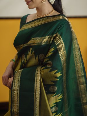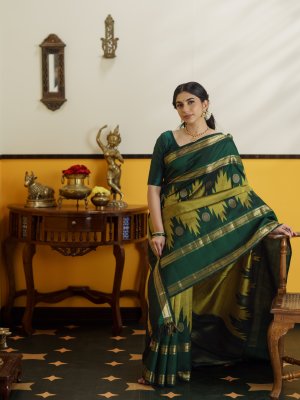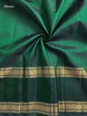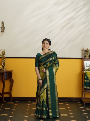 This olive yellow Kanjeevaram silk saree features a striking bottle green thazhampoo temple border adorned with elegant kamalam zari buttas and classic retta pettu detailing. The border showcases a beautiful combination of kamalam and diamond motifs, while the saree is finished with a traditional 4-patta zari pallu, reflecting timeless Kanchipuram craftsmanship.