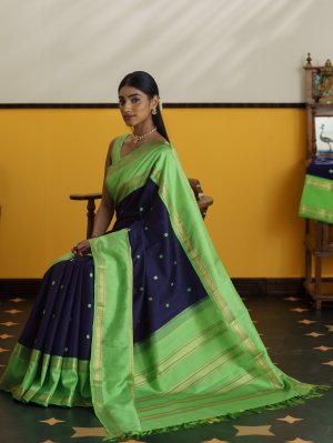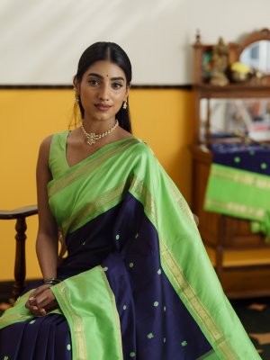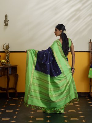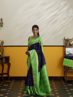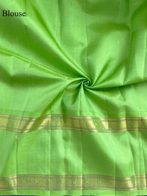 A graceful dark navy blue Kanjeevaram silk saree paired with a vibrant parrot green border. The body is adorned with elegant peacock and kamalam butties woven in silk, adding a subtle traditional charm. The striking parrot green border features a classic retta pettu design highlighted with intricate vanki and kamalam motifs in zari. The saree is completed with a rich 4 patta pallu, enhancing the traditional beauty of this timeless drape.