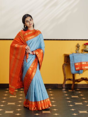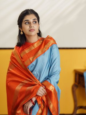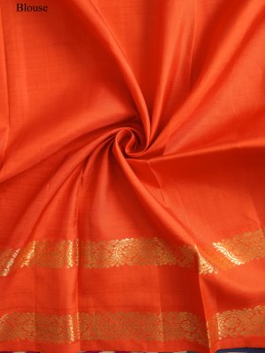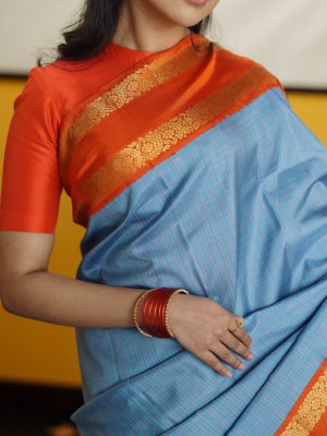 This elegant light blue checked Kanjeevaram silk saree beautifully blends soft hues with vibrant contrast. The body features delicate checks in light blue, lavender, and orange, creating a subtle yet lively pattern across the weave. A striking orange border frames the saree, adorned with traditional kodi kamalam retta pettu motifs in rich zari, adding a classic Kanjeevaram touch. The saree is completed with a rich 4 patta zari pallu, enhancing its traditional charm and grandeur. Perfect for festive occasions, it reflects timeless craftsmanship with a graceful color palette.