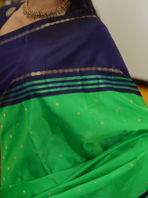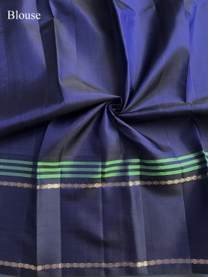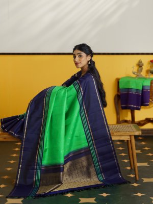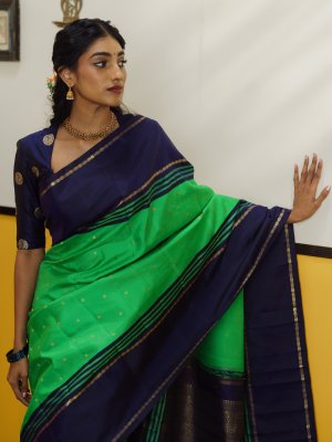 Parrot green Kanjeevaram silk saree paired with a striking navy blue striped border, detailed with green and zari lines and classic rudraksha retta pettu. The vibrant body is adorned with subtle zari buttas, enhancing its elegance. A rich zari pallu featuring 4 patta Iruthalaipakshi (Gandaberunda- two headed bird) motifs adds a majestic and timeless charm to the drape. Perfect for traditional occasions, this saree beautifully blends heritage craftsmanship with bold color contrast.