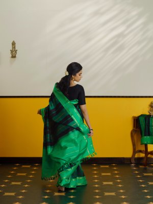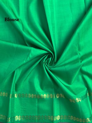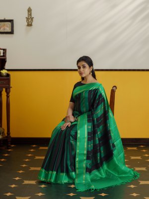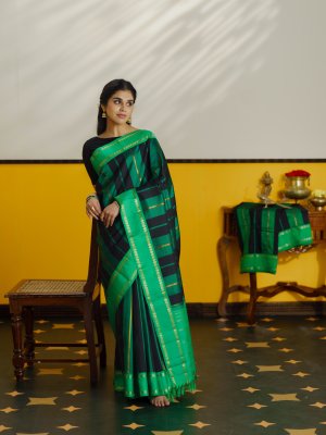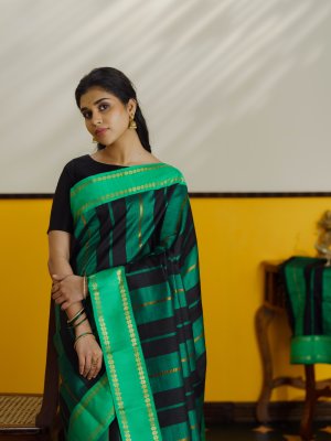 This elegant Kanjeevaram silk saree features striking vertical stripes in rich black and vibrant green, highlighted with fine gold zari lines across the body. The contrast green border is adorned with traditional retta pettu kamalam motifs woven in gold zari, adding a classic touch. The pallu is gracefully designed with a simple muthu seer pattern, enhancing the saree’s timeless appeal. Perfect for festive occasions and refined gatherings.