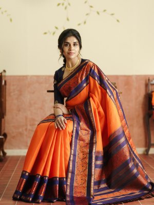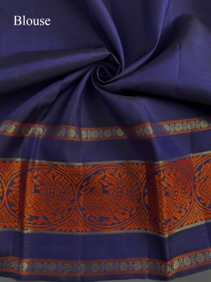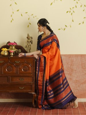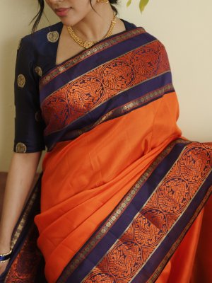 This vibrant orange Kanjeevaram silk saree is a striking blend of tradition and elegance, highlighted by a rich navy blue border. The plain orange body lends a timeless charm, allowing the intricate detailing to stand out beautifully. The border features exquisite round annam motifs in orange pattupettu, along with classic rudraksh and banaras designs woven in fine gold zari. A luxurious two-patta rich pallu adds depth and grandeur to the drape. Paired with a plain blouse, this saree is perfect for making a graceful statement on any special occasion.