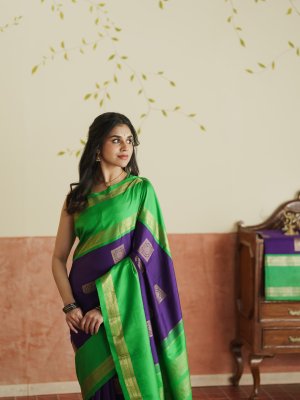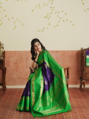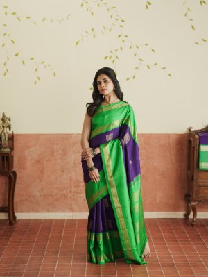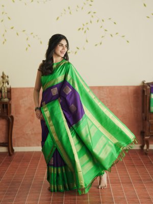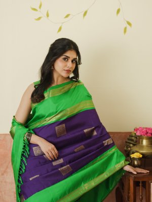 A striking violet Kanjeevaram silk saree featuring a rich parrot green border that creates a vibrant contrast. The body is adorned with elegant square butta motifs woven in gold zari, adding a touch of traditional charm. The parrot green border is detailed with classic retta pettu zari work, enhancing its heritage appeal. It is complemented by a beautifully crafted 4-patta pallu that completes the look with grace and sophistication.