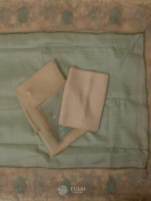 This White Organza Salwar Material With Pastel Green Border exudes delicate charm and refined elegance. Crafted from lightweight organza fabric, it offers a soft, airy feel and a graceful fall. The soothing white base is complemented by a beautifully detailed Pastel Green border, adding a touch of sophistication.