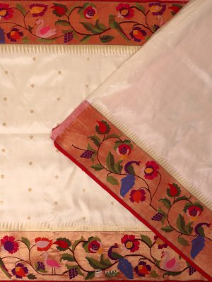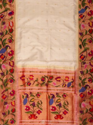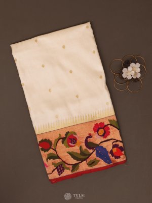 This White Paithani Silk Saree captures the essence of traditional Maharashtrian craftsmanship with its vibrant body and exquisitely woven border. The saree features a rich Paithani border adorned with colorful floral and vine motifs, adding a lively yet regal touch. Subtle buttas on the body enhance its elegance, while the lustrous silk drape gives it a luxurious finish.