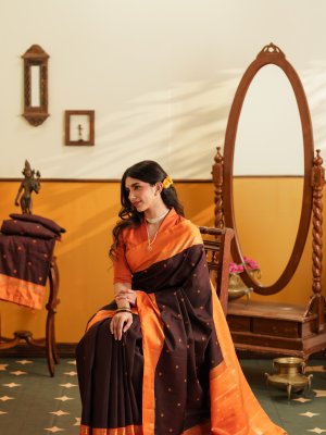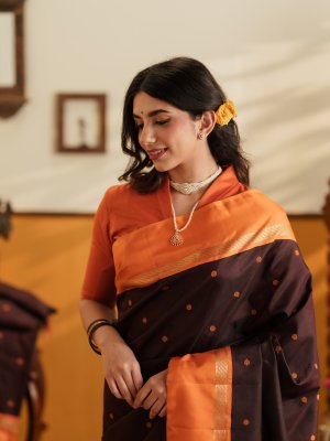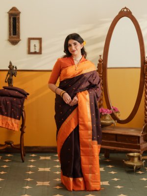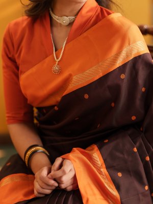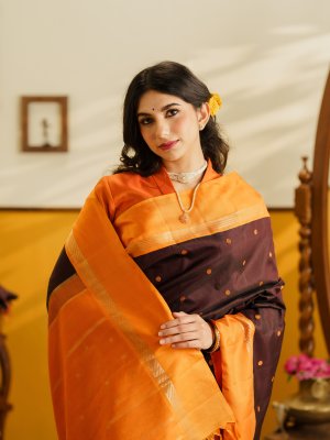 This Wine Brown Kanjeevaram Silk Saree, is beautifully complemented by a rich orange border and pallu. The saree features elegant orange silk butties across the body, adding colour that enhances its luxurious appeal. The contrast orange border, detailed with intricate zari motifs, lends a royal touch to the vibrant orange base.