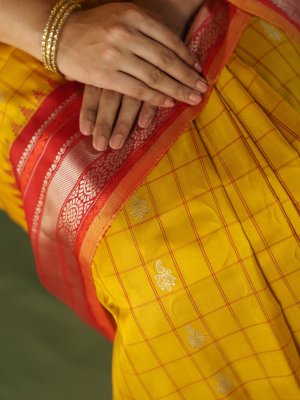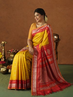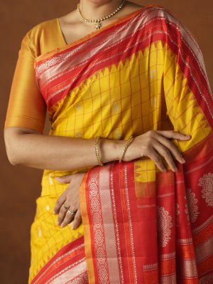 This Yellow Gadwal Silk saree displays a vibrant checkered body enriched with small, shimmering floral buttas that provide a rhythmic, lustrous appeal. The deep red border acts as a firm architectural frame, showcasing silver metallic bands and precise geometric patterns that ensure a sharp, crisp drape. A rich red pallu transitions into a central saffron band, dense with intricate zari paisley medallions and finished with delicate hand-knotted tassels.