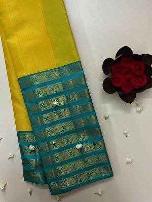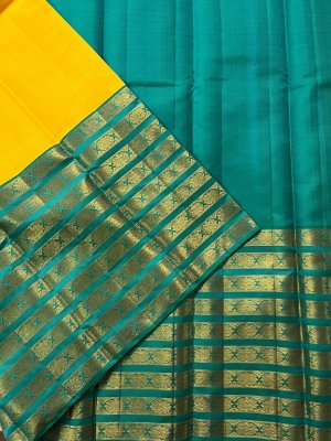 This handwoven mango-yellow Kanjeevaram silk saree is paired with a broad turquoise blue border that is bedecked with pure gold zari detailing.