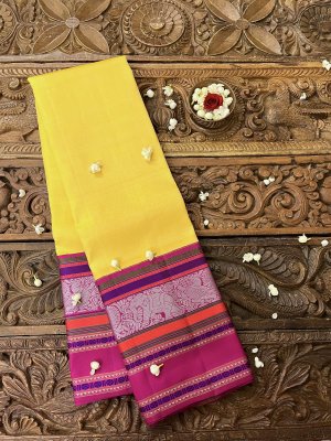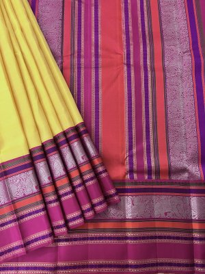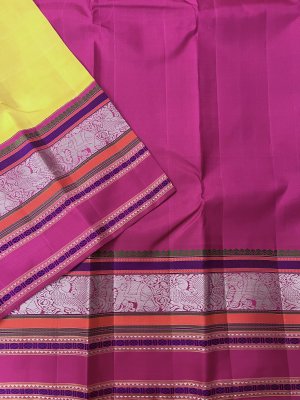 This handwoven yellow kanjeevaram silk saree has a dark pink korvai pattu pett border with annam and yaanai motifs and green, orange, purple silk threadwork along with fine pure gold zari detailing.