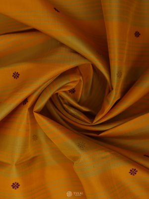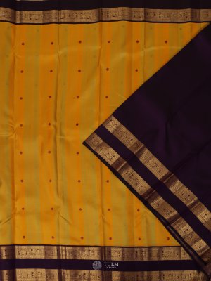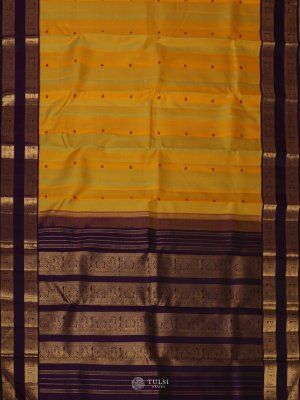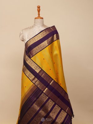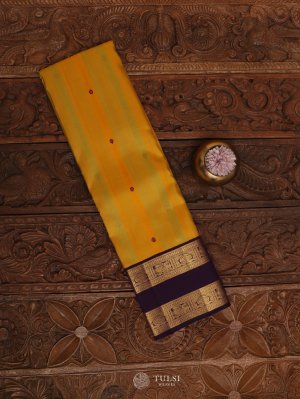 This Yellow Kanjeevaram Silk Saree with a rich Purple Border is a perfect blend of tradition and elegance. The bright yellow body is adorned with subtle woven motifs, adding charm and vibrance, while the deep purple border and pallu are highlighted with intricate golden zari work that enhances its grandeur.