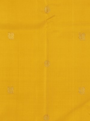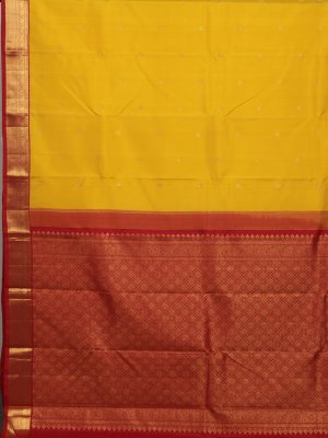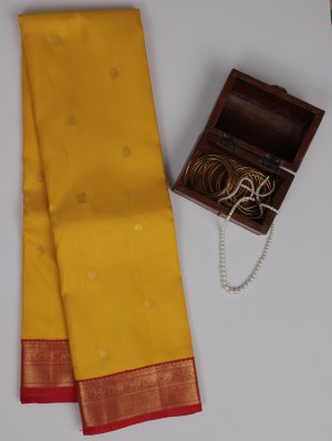 This luminous yellow Kanjeevaram silk saree is embellished with delicate mayil and kamalam buttas spread artistically across the body, celebrating traditional craftsmanship. The striking red contrast border is enriched with majestic elephant motifs, adding depth and cultural elegance. A richly woven red pallu elevates the saree with a bold and royal finish. Completed with a coordinated red blouse, this ensemble exudes heritage sophistication and festive allure.