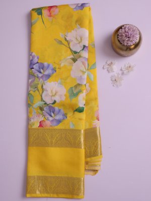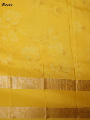 This yellow silk saree reflects vibrant elegance rooted in traditional craftsmanship. Adorned with delicate floral motifs on a luminous silk base, it carries a fresh and artistic appeal. A finely woven zari border adds a touch of classic grandeur and refinement. The coordinated pallu with subtle gold accents completes this graceful and timeless drape.A perfect choice for celebrations rooted in heritage.