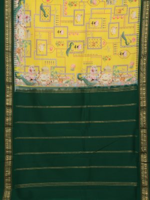 This exquisite Kanjeevaram silk saree showcases a vibrant yellow body adorned with intricate traditional motifs inspired by nature and royal art. Delicate peacocks, florals, cows, deer, and framed patterns are woven beautifully across the saree, reflecting timeless South Indian craftsmanship. The rich green border adds a striking contrast, enhancing the elegance and depth of the design. Perfect for weddings and festive occasions, this saree is a graceful blend of heritage and luxury.