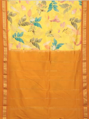 This vibrant yellow printed Kanjeevaram silk saree showcases beautiful nature-inspired prints in soft earthy tones like green, teal, rust, and muted brown, creating a rich eco-print effect across the body. The warm yellow base enhances the organic motifs, lending the saree a fresh yet graceful appeal. Finished with a striking mustard zari border, intricately woven with traditional patterns, this saree perfectly blends contemporary prints with the timeless charm of Kanjeevaram silk. Ideal for festive occasions and elegant daytime wear.