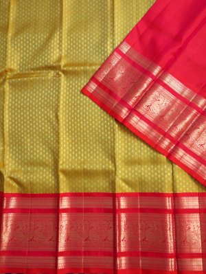 Yellowish Green Kanjeevaram Silk Pavadai with Orangish Pink Border