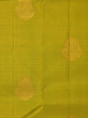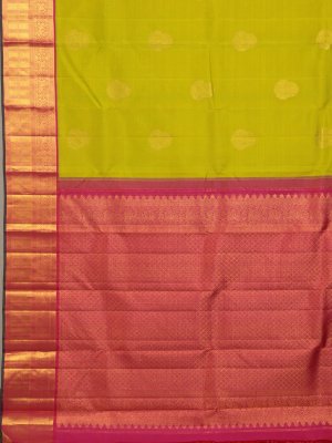 This elegant Kanjeevaram silk saree in a soft yellowish-green hue is adorned with intricate zari buttas on the body for a refined, lustrous effect. Its rich reddish-pink border creates a striking contrast, complementing the beautifully patterned pallu adorned with peacocks and geometric designs. Ideal for festive gatherings and special ceremonies, this saree brings together elegance, artistry, and charm in every fold.